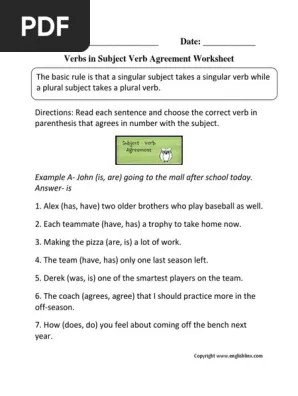 The frogs hop or hops. The subject and verb of a sentence must both be singular or both be plural. Help your third grader practice this important grammar lesson with our free and printable worksheet . Our subject verb agreement worksheets ensure that your verbs are consistent with their subjects, and teach grammatical concord with oodles of examples. Children need to identify the errors and rewrite the sentences correctly.